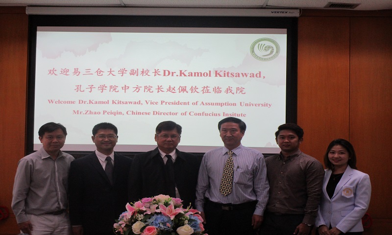 6月12日上午,为增进孔子学院之间的交流沟通,易三仓大学孔子学院一行共同访问中医孔子学院。易三仓大学副校长Dr.Kamol Kitsawad,孔子学院中方院长赵佩钦,华侨崇圣大学主管副校长Dr.Uraipan Janvanichyanon,中医孔子学院中方院长仲强惟教授,泰方副院长李倩中医师出席活动。